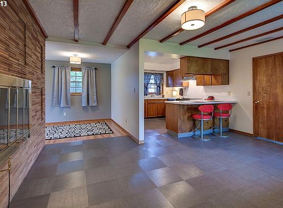 Move-in ready ~ One level w/beautiful newly refinished hardwood floors thruout. Lg mid-century modern living room w/big picture windows, box beam ceiling, 2 frplces w/new stainless steel lifetime dampers. New designer tile floor in kitchen/eating/family room (decide how the space works for you). Brand new tear off roof, new gutters. New garage door opener. All appliances included in retro kitchen. Updated bathrooms with new fixtures.