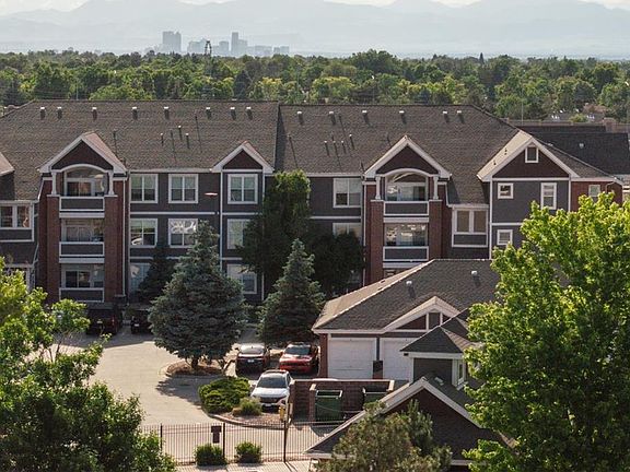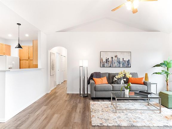 Poised on the top floor, this Cherry Grove East condominium showcases a complete renovation. New luxury vinyl flooring flows throughout complemented by fresh wall color and vaulted ceilings. Admire breathtaking mountain views from large windows and a private outdoor balcony. Elegant new lighting throughout provides stylish illumination. A gas log fireplace adds warmth and ambiance to a spacious living area. The kitchen features quartz countertops and light wood cabinetry. Escape to a generously sized primary bedroom boasting a walk-in closet and an en-suite bath with quartz countertops. A secondary bedroom and bath offer space for a home office or guests. Plush, new carpeting in both bedrooms elevates these serene retreats further. Community amenities include access to a pool and trails. A prime location offers easy access to the University of Colorado Anschutz Medical Campus, Children's Hospital and the VA Hospital plus proximity to dining, shopping, the light rail, I-225 and I-70.