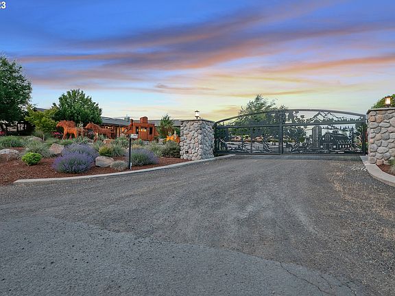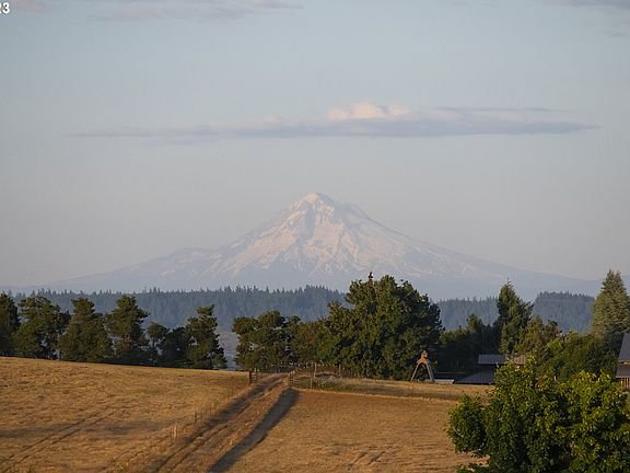 Exquisite one level home nestled in a picturesque setting spanning nearly 20 acres, offering breathtaking views of Mt. Hood. The property boasts an array of amenities, including a remarkable 9,664 sq. ft. agricultural building with its own separate electric meter, featuring 8 garage doors, perfect for storing recreational vehicles and farm equipment. Additionally, there is a well-appointed 3,470 sq. ft. barn with four horse stalls, automatic waterers, and fenced pastures , 200 amp service. The home itself showcases porcelain tile flooring, soaring ceilings, quartz countertops, a luxurious steam shower, as well as upgraded HT-pump and plumbing & a dog wash. Meticulous craftsmanship is evident throughout. Outdoor highlights include a covered patio, a sprinkler system, and fully usable acreage, complete with two electronic gates and a 50 amp RV hook up. This fantastic property offers an exceptional blend of comfortable living and agricultural opportunities.