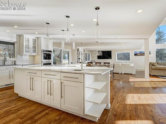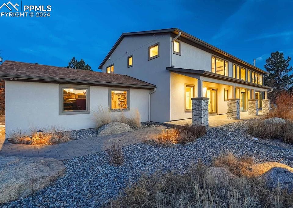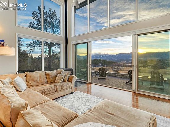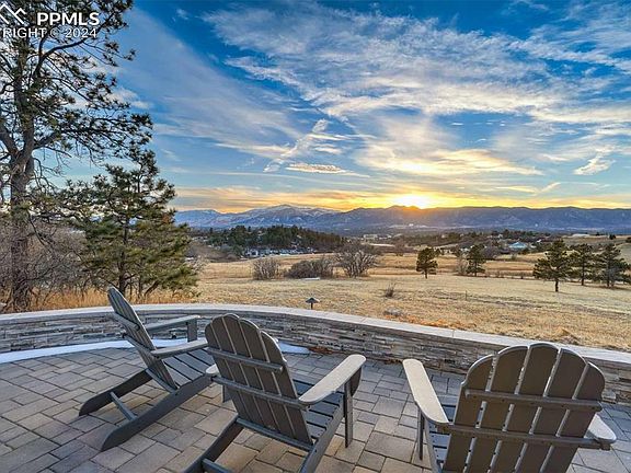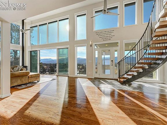 Discover an immaculately-detailed and thoroughly renovated home nestled on 5 acres of serene privacy with panoramic vistas of the Rocky Mountains' Rampart Range. Embrace the tranquility of a secluded acreage community while relishing the convenience of being mere minutes away from the vibrant Northgate district's new attractions, dining, and entertainment.The awe-inducing grand entrance, awaits. A sprawling patio ushers you indoors to a world of high ceilings, an airy layout of 20-foot ceilings, and floor-to-ceiling windows framing a majestic western view. Hardwood floors illuminate the sun-filled space, a bespoke spiral staircase invites memory-making, while integrated surround sound, a cozy wood stove, and top-of-the-line upgrades enhance each day. A chef's dream kitchen is the beating heart of the home. Boasting a sizable island, induction cooktop, dual ovens, triple sinks, double refrigerators, quartz countertops, a generous butler's pantry, and custom cabinetry, the generous space is perfectly complete. Flow seamlessly into the expansive living space, accentuated by a 16-foot sliding glass door blurring the lines between indoors and outdoors and you've arrived at an entertainer's paradise.A private suite on the main floor offers convenience with its own entrance, dual closets, and a lavish bath. Upstairs, the primary suite boasts breathtaking views that include USAFA, complemented by a walk-in closet and a restorative ensuite bath adorned with upscale finishes. Three more generously sized bedrooms, a second laundry station, and another full bath complete the upper level. Aesthetics give way to thoughtful enhancements like automated blinds, a whole-house backup generator, ultra-efficient HVAC systems, a heated driveway, LED lighting, a fully conditioned crawlspace, a sizable barn with dual garage stalls, and covered RV parking. This exceptional residence seamlessly blends sophistication, comfort, and modern convenience—truly a dream home in an idyllic setting.