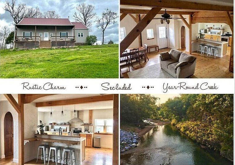 This custom-built, old-world-inspired home is nestled in the foothills of the Ozarks on a private, mostly wooded, 15-acre lot less than 10 minutes from Cabool and Hwy 60/63. It features beautiful views, multiple garden plots, and a quarter-mile long, year-round, spring-fed creek with rock walls and a large swimming hole to cool off on hot summer days.The open floor design is comfortably balanced between strong and rugged and warmth and charm with its exposed steel trusses and timbers; Norwegian brand Jotul wood-burning stove, set on a stone hearth made with rocks harvested from the property; 12' wide wood floors secured with oil-rubbed bronze horseshoe nails; solid-wood, custom interior doors; multiple archways; and open kitchen shelving milled from property-sourced timber.Upon entering, you will encounter a very spacious great room, dining area, and kitchen with an eat-in breakfast bar, all overlooking a beautiful mountain view. The family room is cozy and a step up from the great room. Completely remodeled, the master suite features new custom flooring, shelving, and bathroom fixtures. A smaller bedroom / office, an updated full bath, and a completely remodeled mud/laundry room round out the main floor. Upstairs includes a bonus loft area in between 2 bedrooms and 2 half baths. No space has been wasted with storage closets throughout. Additional updates include new stainless steel kitchen appliances; and ceiling fans throughout.The property can support a small homestead with all of the outbuildings, which include a chicken house, sheds, a storm shelter/root cellar, and a well house. The well pump, aluminum roof gutters (with leaf protection), and exterior lighting were all replaced this year.The beautiful acreage is filled with fruit trees, oaks, cedars, and other foliage that provide food and cover for deer and wild turkeys. Lastly, Cabool is home to The STARS Foundation, the largest fine arts school in the area with over 1