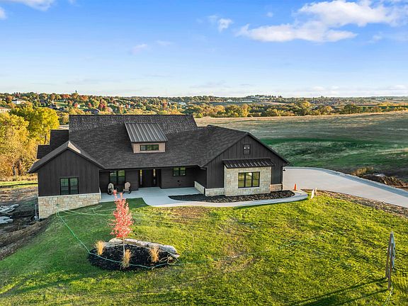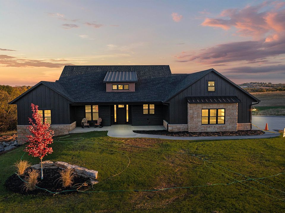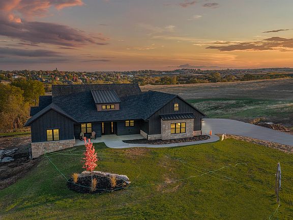 Welcome Home! This home offers a modern look with rustic charm! With its Black smart siding, Oak flooring, and Dubuque stone, this home offer's so much more with such a clean look! Situated on a beautiful, wooded 1.67 acre lot in Country View estates at the end of the cul-de-sac, this home offers the perfect, peaceful setting! Built by CK Construction, this walkout ranch features 5 bedrooms, 4 1/2 bathrooms, and a 6 car garage- 3 car garage up and a 3 car capped garage below. Jack And Jill bathrooms in basement, along with a capped stoop for a possible winery, room for possible movie theatre, and 10 ft ceilings throughout the basement and 9 to 10 ft ceilings throughout the main. An open & inviting main floor plan, sleek, black windows, Black gas fireplace, and an abundance of oversized windows that showcase the breathtaking views of the, wooded backyard! The kitchen masterpiece that includes a Black range hood, white tile. backsplash, tons of storage space, granite countertops, beautiful Knotty Alder wood floating shelves, along with Knotty Alder cabinets, a private walk-in pantry, and so much more...The master suite is like your own private oasis with a tiled zero entry shower, soaking tub in shower, dual white vanities, great cabinet space, and a walk-in closet. Spend your time on the large, covered deck and uncovered deck and look out at your beautiful wooded views. Other upgrades include landscaping, seeded yard, and capped garage. Don't miss your opportunity to make this Rustic Walkout Ranch your forever home. Schedule a tour today!