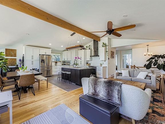 Located on a large corner site in a cul-de-sac, this gorgeous, updated bi-level features 4 bedrooms (2 upper / 2 lower), 3 bathrooms, open concept living/dining/kitchen space, lower level family room, main floor flex room off the 2 car garage (with a workshop/tool shed space) and additional RV parking. Meticulously maintained - pride of ownership shines throughout. This home lives large. The many windows and skylights allow the natural light to cascade in - bright and cheerful. Modern and fresh while retaining wonderful original features - vaulted ceilings, exposed beam in the living room, wood burning fireplace in the family room and some wood accents throughout. The spacious rear yard offers privacy and a wonderful space for relaxing - mature landscaping w/privacy fence OR entertain on the 2 rear patios and deck. No HOA and located in the great Jefferson county school district. Ideally situation for easy access to I70, Hwy 6 and just a short trip to the mountains, hiking trails (less than a mile from Green Mountain Trailhead), parks and more. Just a 5 minute walk to the community pool or Kyffin School. Close to dining, shopping, entertainment and other amenities. Welcome Home!