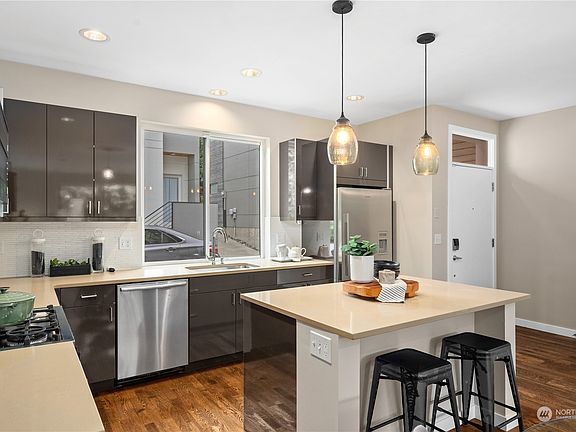 A contemporary freestanding townhome that lives like a single family residence. Main floor entry to the kitchen, dining and living room, all adjoining a private backyard garden patio for outstanding indoor/outdoor living. Large east facing terrace off the primary suite for magnificent morning sunrises from behind the Cascade Mountains and downtown Bellevue. Two second floor bedrooms with full hall bath and laundry closet create seamless functionality and comfort. The sumptuous top floor primary suite is generously sized with custom built walk-in closet and spa bathroom featuring a spacious walk-in shower. One car off-street parking space. Fresh interior/exterior paint, refinished hardwoods, and new carpet. Walk Score 94. Bike Score 91.