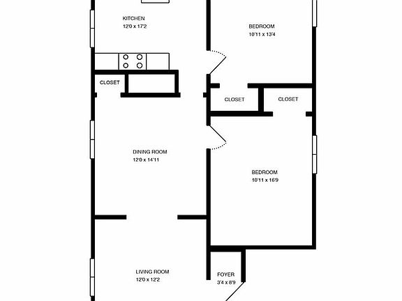 - Main Level: Living Room, Kitchen, 2 Bedrooms, 1 Bath