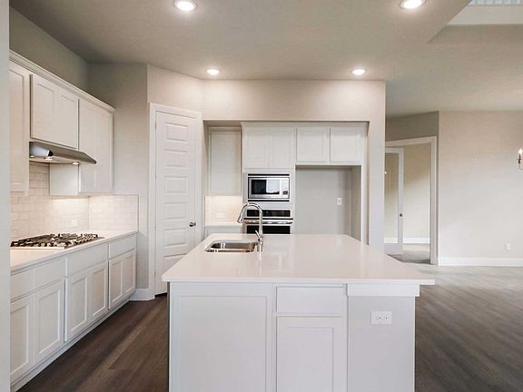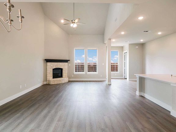 Model floor plan! Large covered front porch, bay windows in master bedroom, master bathroom includes an oversized walk in shower, stone fireplace in family room, built in wall oven and microwave in the kitchen with white painted cabinets, upgraded quartz countertops in the kitchen, 42-inch upper cabinets, 6-inch baseboards, 8-foot door throughout.