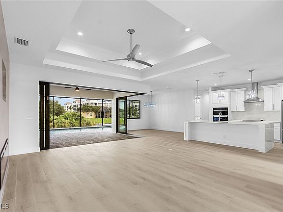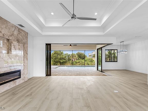 Stunning Gulf-access home with soaring ceilings and expansive pocket glass doors for seamless indoor-outdoor living and canal views. The elegant marble fireplace anchors the great room, while the chef’s kitchen features quartz countertops, waterfall island, premium appliances, and spacious walk-in pantry. Modern designer finishes, a private office with barn doors, and a luxurious master suite with spa-style walk around shower and soaking tub. Wood-look porcelain tile floors ensure warmth and durability throughout. Step outside to a custom outdoor kitchen, paver patio, and sparkling pool on the canal—perfect for entertaining. A three-car garage, epoxy flooring, paver driveway, and landscaped grounds complete this upscale retreat. Experience the best of coastal living, ideal for families, entertaining, or relaxing lifestyle.