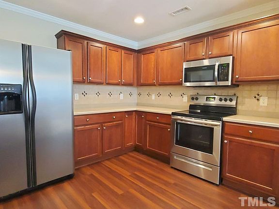 Open floor plan with beautiful laminate wood floors in foyer, office, dining room & kitchen. Spacious & bright living room with gas fireplace is open to kitchen which features solid surface countertops, tile backsplash, stainless steel appliances, pantry & large breakfast bar. Office with full wall built-ins. Roomy master suite with walk-in closet & dual sinks. Patio for relaxing outside. Two car garage, plus extra parking pad. Just off Highway 401 on the north side of Fuquay Varina. $30 monthly pet fee