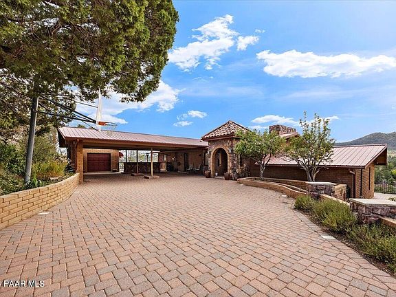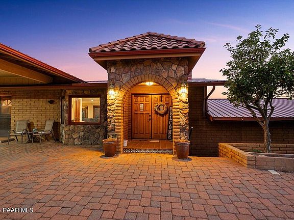 This stunning home, boasting long, sweeping views and located less than three miles from Historic Prescott's downtown square, has undergone well-thought out updates throughout. Perched at the top of a serene street, the property offers a level driveway and a porte-cochere, setting a welcoming tone with its modern design fused with classic Spanish influences. Upon entering, you're greeted by a breathtaking wall of windows in the great room that frame the tall pines of the Prescott National Forest, allowing natural light to pour in and enhancing the home's seamless connection to its surroundings. The entry level features elegant wood floors, highlighted by a striking floor-to-ceiling stone, two-way wood-burning fireplace that serves both the great room and the adjacent cozy family space.