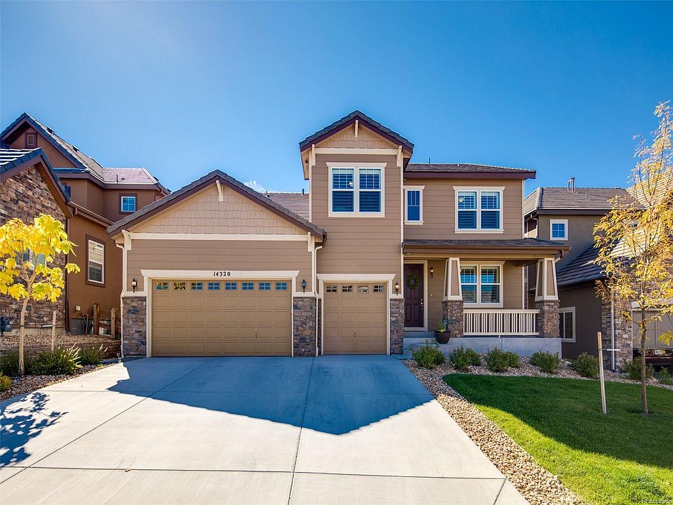 Like-new 2014 home in Meridian Village offers gorgeous interior and quality finishes throughout. Step inside onto Florence maple wide-plank coffee colored hardwoods that continue throughout the main level. Dining room topped with coffered ceiling with crown molding. Windows throughout sport classic plantation shutters. Smart butlers pantry has glass-fronted fridge and cabinets. Pantry connects to roomy kitchen lined with wall-to-wall granite counters. Stainless appliances include double oven and range with vented hood. Kitchen island seats 3 under a trio of pendant lights. Open floor plan. Large family room stays cozy with gas fireplace encased in tile surround and handsome wood mantle. Master suite offers coffered ceiling, 5-piece bath, and huge walk-in closet with custom shelving. All baths have granite counters and tile floors. Backyard is plumbed for firepit and grill. HOA includes community pool. Minutes from Tech Center, highway, malls. Get settled to start the new year fresh!
