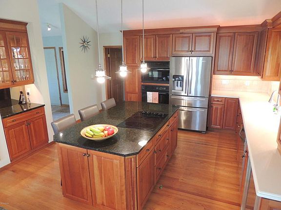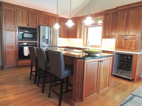 Contact Darrell. Living on the water with this 4 bed 3 bath walkout estate. 200' of frontage on private Lake Bearslee of the Chain Lakes. An active person's dream with fishing and kayaking miles of water connecting to the Flat River. Gourmet kitchen boasts custom cherry cabinets, hard surface tops, granite island, wine fridge, 2-sided fireplace, and stainless. Entertain your family and friends with waterfront views from both the large 30' fully enclosed Michigan room with custom built-in grilland industrial stainless hood system... and the oversized 12'x60' deck. Large master suite w/ private deck and a view. Lower level walkout with large entertainment room w/ built-ins, full kitchen, 4th bedroom w/ WIC, 3rd full bath, and flex room. Meticulously maintained and countless updates. Ultra energy-efficient 6'' foam filled wall and roof construction, Generac whole house generator, UGS, high efficiency furnace. Make this oasis yours today. Contact Darrell.