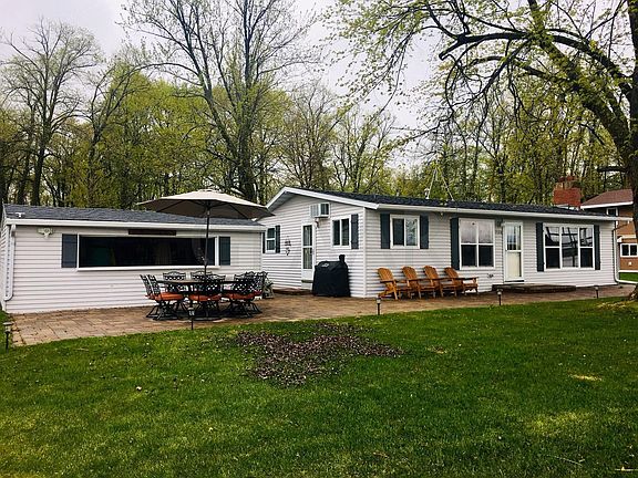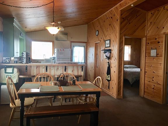MAPLE LAKE! Relax and enjoy lake life! Cute move in ready 3 BR cabin w/fireplace, vaulted pine ceilings and walls, updated flooring and bathroom. Extra large lot w/150' of beautiful sandy beach! Paver patio, landscaped yard with sprinklers, paved driveway, steel siding and newer windows plus a tiki bar in small shed. Sold partially furnished.