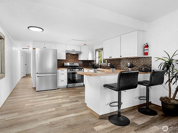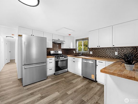 Covered parkingStunning kitchenLow-maintenance landscapingUpdated lightingButcher block countersWarm mosaic tile backsplashWhite cabinets