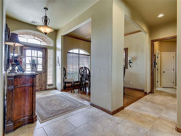 Absolutely stunning! Want some room to roam and space between you and your neighbors? This is the home for you! A true entry way welcomes you into this home overlooking the formal dining room and living room. Soaring windows make the living room light and bright. Kitchen is open to living and dining room. Kitchen has built in desk, island, bar seating, and plenty of workspace. Master suite has tray ceiling, door to patio, walk in shower, jetted tub, and spacious walk in closet. Second bedroom has its own bath and could be used as a study. Third and fourth bedrooms are connected by a bathroom and are separated from other bedrooms. Three car, oversized garage and storm shelter. Large back patio with a view of neighborhood pond. This home is light and bright and move in ready! This home is situated on .75 acres and in Deer Creek schools.