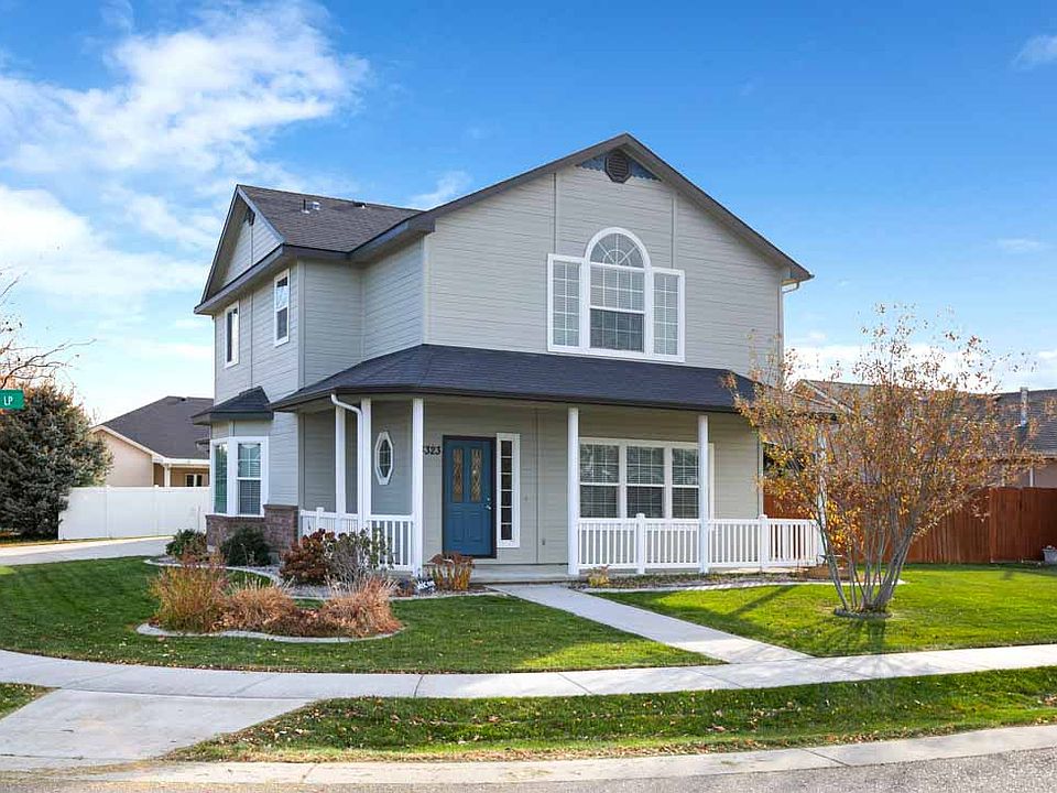 Charming home on a corner lot with a wrap around front porch! Spacious living room with a gas fireplace. An open kitchen with a breakfast bar and backyard access. The dining nook features a custom bay window. Master bedroom has vaulted ceilings and big windows bringing in natural light. Upstairs has 3 bedrooms and a bath. Backyard is fully fenced with a covered patio and space for all your toys. Oversized 3 car garage. Located in a great Nampa neighborhood.