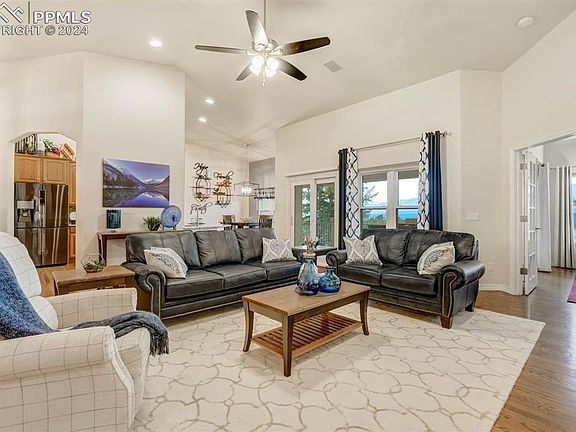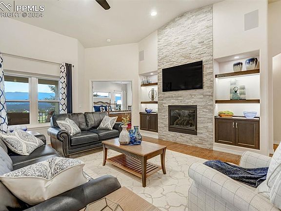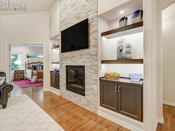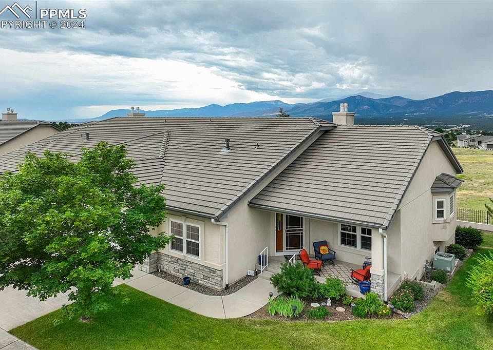 Welcome home to this remodeled bright & open rancher nestled in the desirable gated Eagle Villa Grove community. Backing to open space offering unobstructed views of Pikes Peak, Air Force Academy & the Front Range. Solid Oak hardwd flrs greet you at the entry & flow throughout the main lvl. The covered porch entry opens to the great rm, boasting a wall of windows that captures the mtn views & let the natural light pour in. Boasting vaulted ceilings, in-wall speakers, new custom cabinets & floating shelves, & a gas FP w/gorgeous flr-to-ceiling stacked stone. The eat-in, gourmet kitchen has views of the mtns, new stylish granite counter tops, new stacked stone backsplash, can lighting, molded-in sink, cabinets w/updated brushed nickel hardware, pantry, & newer black SST appliances. The adj dining nook has modern lighting & great views. From here, walk out to the covered, elevated, composite deck taking full advantage of the panoramic Pikes Peak view. Perfect for summer BBQ’s & soaking in the sunshine. Back inside, the flexible formal dining space boasts convenient access to the kitchen. Escape to the main level master retreat offering vaulted ceilings, wood floors, adj 5-pc bath w/soaking tub, frameless glass shower dr, tile flr, granite dble vanity & walk in closet. Additional main lvl 2nd bedrm w/easy access to a full bath w/ granite counter tops, as well as, an office w/french-doors, built-in bookshelves, & a built-in desk. The walk-out basement w/9’ ceilings has a large open family rm w/ in-wall speakers, wet bar, & gas FP. The 2 bsmnt bedrms share a full bath w/dble vanity. There is also a storage rm w/cabinets & LVP flr. Other bonus features incl; newer designer interior paint, stucco ext, pro landscaping, central A/C, energy efficient windows, & garage w/workbench, epoxy flr, heater, cabinets. This home is surrounded by the wonders of Colorado, yet in proximity to all the conveniences, shopping, entertainment, D-20 schools, & easy access to major roads.