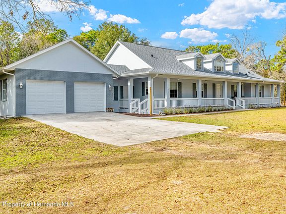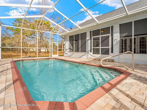 ACTIVE UNDER CONTRACT **BROOKSVILLE BEAUTY** Must see this 2007 quality built POOL home with a gorgeous wrap-around rocking chair front porch on 4.60 acres, zoned AR2 (Agricultural Residential 2). This 3 bedroom home with office, 2.5 bath (including pool bath) is 2,651 sq ft of living & 4,275 sq ft under roof. NEW ROOF in 4/2023 with transferable warranty. Efficient SALT WATER POOL has electric heat pump so you can swim in comfort all year long + paver flooring throughout pool area! This beautiful ranch style home has 3 roof dormers that lets in the natural light. Interior features include PORCELAIN TILE throughout the home & carpeting in the bedrooms, all wood HICKORY finished CUSTOM CABINETS, custom blinds, vaulted ceilings with ceiling fans throughout. Master bedroom has french door to back porch/pool area. Master bath includes his/her closets, dual vanities with sinks, big snail style walk around shower. Huge kitchen with quality QUARTZ countertop, all appliances, huge pantry, kitchen dining nook with pool view, formal dining room, great room & living room have french doors to back porch & pool area that includes a convenient 1/2 bath, outdoor shower and a 50 amp box, perfect for a Hot Tub. This home design is loaded with storage cabinets! You will love the big laundry room located in the enclosed breezeway to the garage, offering a washer/dryer, laundry tub & an additional door to front porch. The 2 car garage has separate doors with dual openers & outside garage has a 30 amp box, perfect for an RV hook-up. Front & back porches have tongue & groove spruce ceilings. Home has a 5 ton A/C unit with 2 zones. Property is fully fenced with 4 gates. Home is also being sold with the house only on 1.20 acres MLS 2250989 for 625K. Live in the country with all the conveniences of the city, including the Suncoast Parkway just a few miles away making an easy commute to Tampa.
