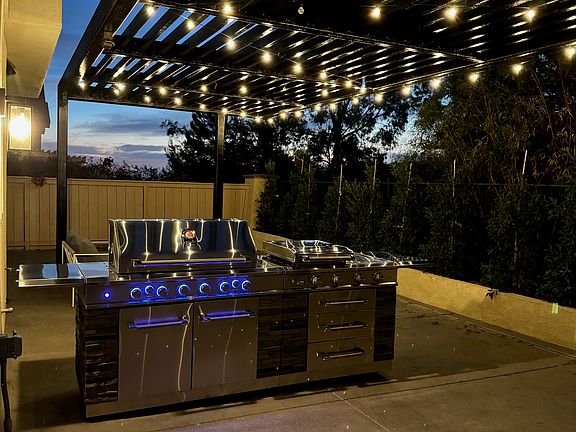 Outdoor features include a large covered shade structure with lighting, a fully built outdoor kitchen, and new professional landscaping in both the front and rear yards. The private backyard is lined with tall hedges to ensure privacy, making it an ideal space for entertaining or quiet relaxation.