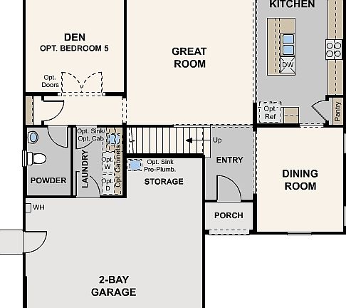 The Indigo boasts a beautiful open-concept layout designed with your comfort and convenience in mind. Main-floor highlights include a formal dining room with a dedicated passthrough to the kitchen, featuring a center island, pantry, and sliding glass door to the backyard. The kitchen also flows into an expansive great room. And completing the main floor, a secluded den--also available as a downstairs bedroom--overlooks the backyard. Upstairs, you'll enjoy a versatile loft, along with two secondary bedrooms--sharing a full hall bath--and a lavish primary bedroom with a walk-in closet and en-suite bath. Additional options include an extra bedroom in lieu of the loft.3 Bedrooms / 2.5 Baths / Dining / Den / Loft / 2 Bay GarageOpt. Covered PatioOpt. Bedroom 4 at LoftOpt. Bedroom 5 at DenOpt. Retreat at Bedroom 2Opt. Tub at Primary Suite