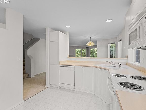 Introducing an upscale townhouse-style condominium featuring three bedrooms and two and a half bathrooms, spanning 1,287 square feet. This end unit is filled with natural light throughout. The main level showcases an open-concept living area, highlighted by a welcoming living room with a fireplace and a sliding door to the covered patio, a dining room with charming bay windows, and a spacious kitchen with ample storage and space for a bistro table. Additionally, the main level includes a half bathroom, laundry area equipped with a washer and dryer, along with additional storage space.All bedrooms are thoughtfully situated on the upper level. The primary bedroom features two closets and an on-suite bathroom. Two additional bedrooms and a full bathroom with a soaking tub complete the upper level. The property also offers a one-car garage and an extra reserved parking space in front. Ideally located, this home is close to New Seasons, Washington Square and Progress Ridge Town Square. Well run HOA and exceptionally maintained community.