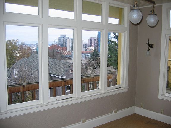 This unique property is the main floor of a close-in historic home that was converted to a four-plex many years ago. The home combines the views and close-in proximity offered by high-rise condos with the architectural charm of a Portland Heights home. Located just above Portland State University and the Cultural District on Gander Ridge, residents can easily walk downtown to PSU, the farmers market, Art Museum and Streetcar. Built in 1911 in a Frank Lloyd Wright inspired Prairie Style. The large living rooms and kitchen make this a showpiece perfect for entertaining. There are views of the city and Mt. Saint Helens from the den, bedroom and the back deck. This very large (approx. 1600 square foot, excluding basement) home has been completely updated throughout without compromising its original charm. The large gourmet kitchen has Cherry cabinets, Black Granite countertops, hardwood floors, dishwasher, Viking commercial gas stove and a stainless steel refrigerator. The large living room and dining room have hardwood floors, high ceilings, leaded glass built-in cabinets, skylight and fireplace. The den or office has a second fireplace with a full wall of windows with city views. The large master bedroom has box beam ceilings, a walk-in closet, bathroom and a large window with a great view of the city. A second bedroom and bath are on the lower floor There is another private deck in the front of the house accessed by French doors. The large basement is shared with another apartment and has lots of storage space. Front load Washer and Dryer is in the basement and shared with one other apartment. Owner pays for water and garbage service. Resident pays for Gas (Furnace & Stove) and Electricity. Parking is on the Street with a City Zone B permit that costs $75 per year. Strict policy of no pets and no smoking inside. 1 year lease