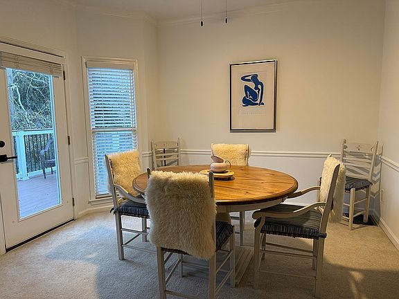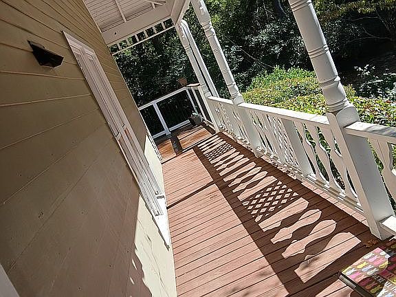 From both the entry hallway and the kitchen, you enter the living spaces on the back of the home. On the left is a spacious living area with cozy fireplace and on the right is a large dining area. Nice, newly cleaned carpet and huge windows across the back complete these areas. Dining and living are open concept, and they oversee and open onto the back side of the wrap around porch. The deck area is big enough to entertain, have a potted garden or just enjoy the quiet, privacy. It also includes an additional exterior storage closet.