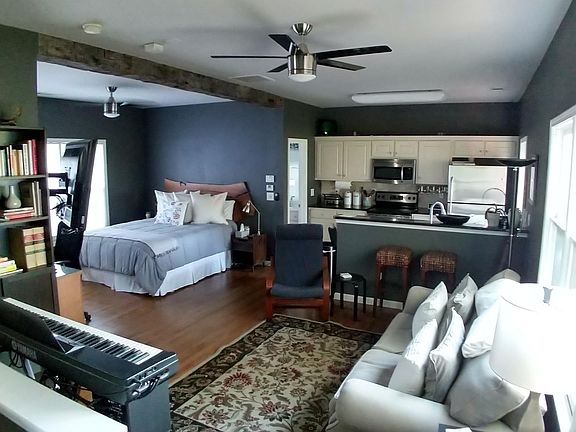 Rare find. This is a free-standing (no shared walls) 1 bedroom unit with open floor plan, deck, and 2 car garage. Sunny and private. Antique reclaimed wooden beam ceiling, wood floors, marble counters, stainless appliances, private patio. Washer and Dryer in unit. Custom cedar closet. Private assigned parking place at front door. Lease rate includes garbage collection and HOA (yard maintenance). Tenant responsible for water, electricity, gas, internet, TV. Applicant screening fee: $39.99 non-refundable through cozy.co Dogs must meet with landlord and require additional $800 security deposit. Cats require additional $300 security deposit. Payments due upfront on monthly renewal date; pay online.