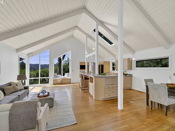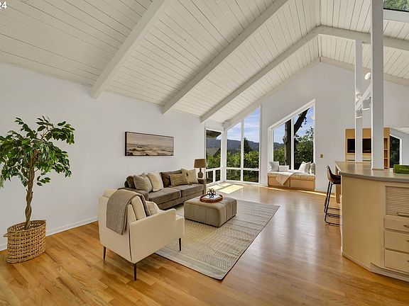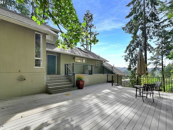 NW Contemporary home with stunning views of the western hills and sunsets, spacious living areas, light and bright great room style, with open beam and vaulted ceilings, spacious primary bedroom suite with walk-in closet, built-ins, spa bathroom with soaking tub, walk-in shower, and a private outdoor patio with water feature; kitchen is fully applianced with an island, breakfast bar, nook/pantry and skylight; 2nd bedroom with built-ins and bath, 3rd bedroom loft with pass-through den area, new interior and exterior paint, new roof in 2020, spacious deck (25x19) for outdoor living, and located on a 0.32 acre lot in the SE hills. This home is move-in ready and South Eugene schools.