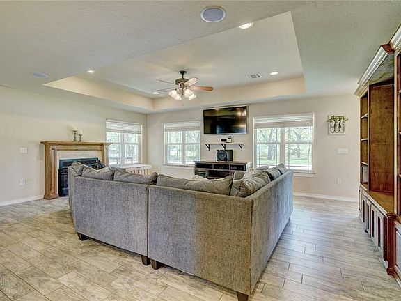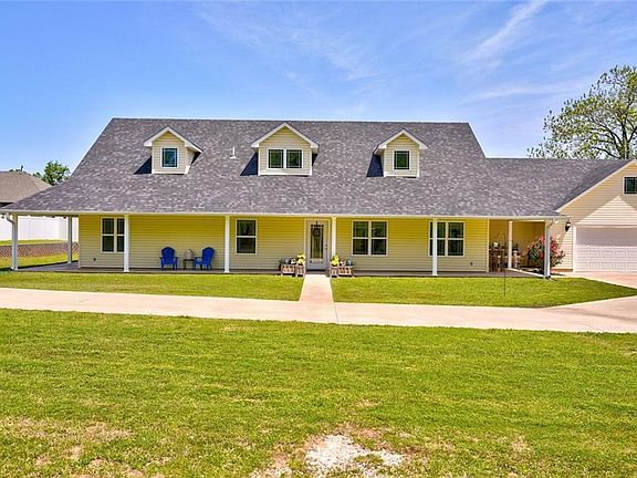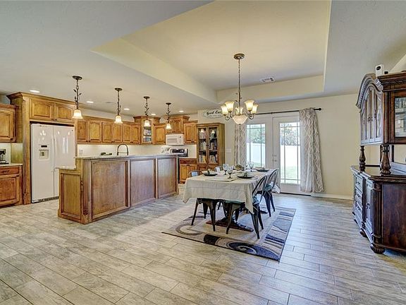 Welcome to your charming yellow farmhouse with a wrap-around porch! This adorable home on almost an acre lot offers 3 bedrooms, 2 bathrooms, a study, and a 3-car garage. The open-concept floorplan creates a spacious and inviting atmosphere, complemented by a cozy fireplace and vaulted ceilings in the living room. The kitchen is a chef's dream, featuring ample counter and cabinet space, an under mount sink, and a convenient walk-in pantry. Wood tile floors add a touch of elegance throughout the home, while the bedrooms offer plush carpeting for comfort. The master bedroom boasts a large walk-in closet, a stand-alone shower, and a luxurious walk-in tub. For added peace of mind, a safe room is located in the master closet. The laundry room is equipped with cabinets and a counter for convenience. Don't miss out on this delightful farmhouse retreat in Shawnee School District with no HOA!