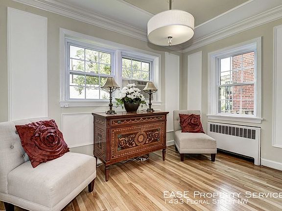 Welcome to 1433 Floral Street. This beautiful center hall colonial home has a great Shepherd Park location and is just steps away from Rock Creek Park. The house features modern updates throughout while still keeping the home's original character intact. Home Features:. Beautiful hardwood floors throughout. Formal living and dining rooms. Gourmet kitchen with granite countertops and high-end stainless steel appliances. Sun room on main level, perfect for morning coffee. Powder room on main level. Upper level leads to a spacious master bedroom with a great ensuite bathroom. Good sized second and third bedrooms with an additional full bathroom in the hallway. Fourth bedroom on third level with an additional den/office. Full finished basement with tall ceilings and additional powder room. Fenced-in backyard, perfect for escaping the indoors. Parking:. Two-car garage parking included in rent. Utilities:. Tenants are responsible for all utilities (gas, water & electric). Lease Terms:. Available August 1, potentially earlier if need be. Minimum 12 month lease. Pets considered on a case-by-case basis pending approval by Owner. Credit check is required and the cost is $25 per applicant. Security deposit equal to one month's rent due upon lease signing. Location:. Shepherd Park is a quiet, residential neighborhood bordering DC and Maryland. Extremely convenient to all of the great shops/restaurants in downtown Silver Spring. Perfect for downtown DC commuters too with easy access to 16th Street. Just steps away from Rock Creek Park with endless hiking trails.