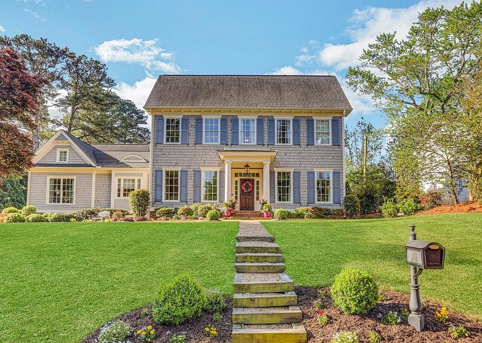 Southern Charm meets the Hamptons in this custom built colonial farmhouse. Set on a spacious corner lot with lush, professional landscaping and masterfully designed by JP Curran (Curran & Co), no detail has been overlooked inside or out. From the moment you step through the front door, you will be struck by the thoughtful, well-balanced layout, light-filled spaces, and refined finishes. Rich hardwood floors flow from the formal dining room to the study/formal living with new French doors to the family room with brick fireplace flanked by elegant built-ins to the open, gourmet kitchen featuring high end appliances, including double refrigerators/freezers and 6 burner gas stove with grill, a large walk-in pantry, and butler's pantry to discreetly store your smaller appliances and servingware. The living room leads out to your own private backyard oasis featuring a swimming pool, patio with wood-burning fireplace, outdoor television and plenty of space to grill or dine al fresco. Master on main boasts cathedral ceilings and a marble spa-like bathroom with walk-in closet featuring custom designed closet systems. Private bedroom suite above the garage has its own set of stairs with ample space for a queen bed, a small living space and a full bathroom. Head up the grand staircase to find 3 additional bedrooms, each with their own private bathroom and ample closet space with custom closets. This level also hosts an oversized room perfect to use as a playroom, workout space, office, or additional hangout space. The newly finished lower level features a beautiful half bathroom, a large living space with a home theater and a bar for entertaining, plus even more storage space. Just a short stroll from Village Place Brookhaven or a short drive to Buckhead and Midtown!