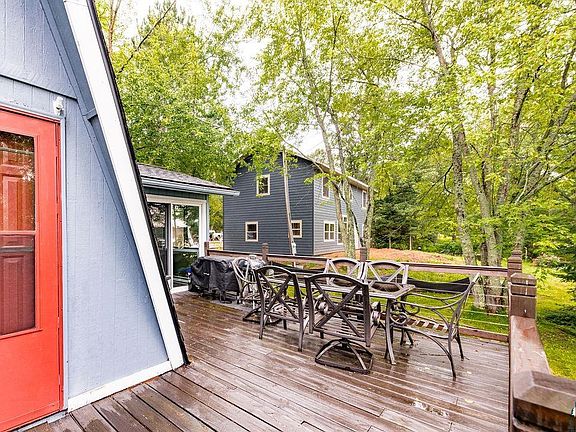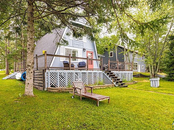 This charming modified A-frame cabin can be your perfect summer getaway. The main floor bedroom and eat-in kitchen provide convenient living spaces while the loft could serve as an extra bedroom or cozy nook. The wrap around deck is a great feature offering panoramic views of the lake, ideal for relaxing or entertaining and watching the beautiful sunsets.