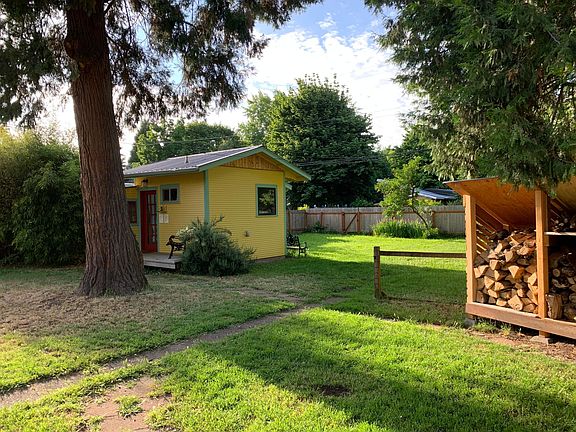 This classic Bungalow in Whiteaker neighborhood has a large backyard with a detached garage that is currently being used as a workshop but that could also be used as a studio. It already has water and electric plumbed out (but no sewer). There is also another detached structure that is currently being used as a bedroom but that would work well as a studio. The house includes a new front-loading washer, a dryer (great condition), a reconditioned forced-air furnace, and a small unfinished basement (currently housing the washer/dryer). There has also been a service upgrade and 80 percent of the electric has been rewired with Romex cable. The inside of the house has beautiful old growth fir molding, hardwood floors, and 10+ foot ceilings. There are seven light tubes, ensuring brilliant lighting all day, even with windows closed. The kitchen has a gas range, tile floors and extra cupboard space in the basement stairwell.