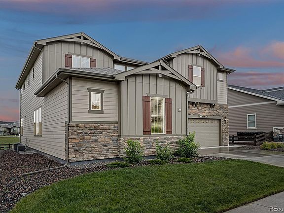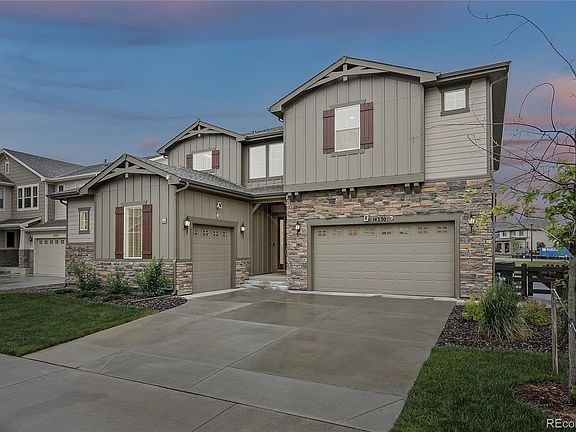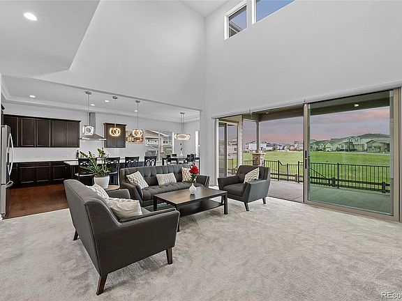 This inspiring and inviting home is the deluxe version of the Dillon model from The Point Collection with many stunning upgrades and surprising extras. The magnificent two-story design offers majestic views and stylish details from the grand entrance staircase into the two story great room, to the elegant large kitchen with extended center island, all of which open to the full-length covered patio merging the outside with the inside via three luxurious sliding glass panels. The manicured backyard borders green space and includes an expansion pad for additional entertainment or a fire pit. The well-appointed kitchen with stainless steel gourmet appliances provides endless counter space with adjacent casual dining which also adjoins the covered patio and is complete with a walk-in pantry and convenient access to formal dining and butler pantry. The main floor also offers a large study and powder room with linen closet and mud room. Additionally, a one car garage provides room for extra vehicles and space for a workshop or storage. The second level has four bedrooms including the Primary suite which is located away from the other bedrooms allowing for privacy. The Primary bathroom consists of two vanities, a bathtub, a separate shower with seating, and an extra large walk-in closet. There are two bedrooms which share a full-size Jack and Jill bath with two vanities and another bedroom with private access to full-size bath. The laundry room is conveniently located on the second floor. This home is complete with a full unfinished basement and three large egress windows allowing for room to grow! Be a part of our amenity rich community in Thornton! North Hill’s resort style amenities center features community gathering rooms, a zero entry community pool, hot tub and state of the art fitness center. Located near highways, schools, trails, Mckay Lake, a 9-acre park with basketball court, shopping at Denver Premium Outlets, Orchard Mall, theaters, dining and Topgolf.