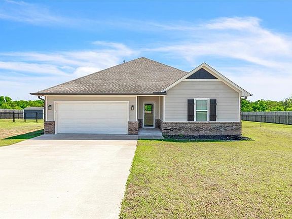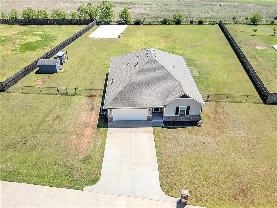 Come build your shop on this beautifully property with an upgraded home! Privacy, and quality throughout, set on a fully fenced .75-acre lot that backs to a peaceful wooded greenbelt. A rebar-reinforced 31' x 51' concrete pad is ready for your future shop or sports court, with convenient double gate access on the north side and a single gate on the south. The expansive 32' x 24' back patio includes a built-in firepit and a newly installed gazebo, with a 10' x 8' shed to complete the backyard setup. Inside, the open-concept floorplan features white quartz countertops, a large island, and new stainless steel appliances in the kitchen, along with a single-basin sink and newer faucet. New carpet has been installed throughout, along with ceiling fans in every room and freshly painted baseboards. Each bedroom includes a walk-in closet, and multiple hall closets provide rare, additional storage. This home also includes a whole-home water softener, a storm shelter less than a year old, a home security system with four outdoor cameras and full door/window sensors. With modern upgrades, thoughtful features, and room to grow, this home is truly move-in ready. HOA covers private road!