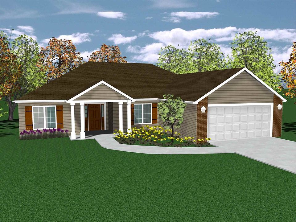 ILLUSTRATION SHOWN FROM FOUNDATION STAGE UNTIL SIDING IN ON. Lancia's split Bedroom ranch, the Mandalay has 1,644 sq.ft. with 3 Bedroom's, 2 Bath's, an Office-Bonus Room and 3-Car Garage. Foyer features vinyl plank flooring and leads into the Great Room with stone flat hearth with mantle surround vented gas fireplace, conduit for tv above and 9' raised tray ceiling with crown moulding and can lighting. Great Room is open to Nook and Kitchen. Nook leads to 12 x 12 Patio. Kitchen has dual door pantry, additional gas line hook-up is standard, stainless steel appliance package, granite countertops, island includes a breakfast bar, ceramic tile backsplash, painted cabinets, dovetail drawers and soft close doors. Bonus Room-Office has French Doors. Separate Laundry Mudroom off Garage has upper cabinets for laundry supplies and closet for winter wear. Owner Suite Bedroom 1 has a ceiling fan, nice view of the backyard. Owner Suite Bath has 3 x5 ceramic shower with bench and fiberglass pan, dual sink vanity ceramic flooring. Dual rod & shelf 1-wall unit in the walk-in closet. Another 2 Bedrooms on opposite side of home for more privacy. Designer white laminate wood shelving in all closets. Deco mirrors in both Bathrooms. Vinyl plank flooring in Kitchen, Nook Foyer, Hallway and Main Bath. Designer white laminate wood shelving in all closets. Front elevation has curb appeal with vinyl shakes, stone columns, board and batten trim. Home has Simplx Smart Home Technology - Control panel, up to 4 door sensors, motion, LED bulbs throughout, USB port built-in charger in places. Finished 3-Car Garage has attic access with pull-down stairs and 2 sheets of OSB board. Partial view of the pond. 2-year foundation to roof guarantee and a Lancia in-house Service Dept. (Grading and seeding completed after closing per Lancia's lawn schedule.)