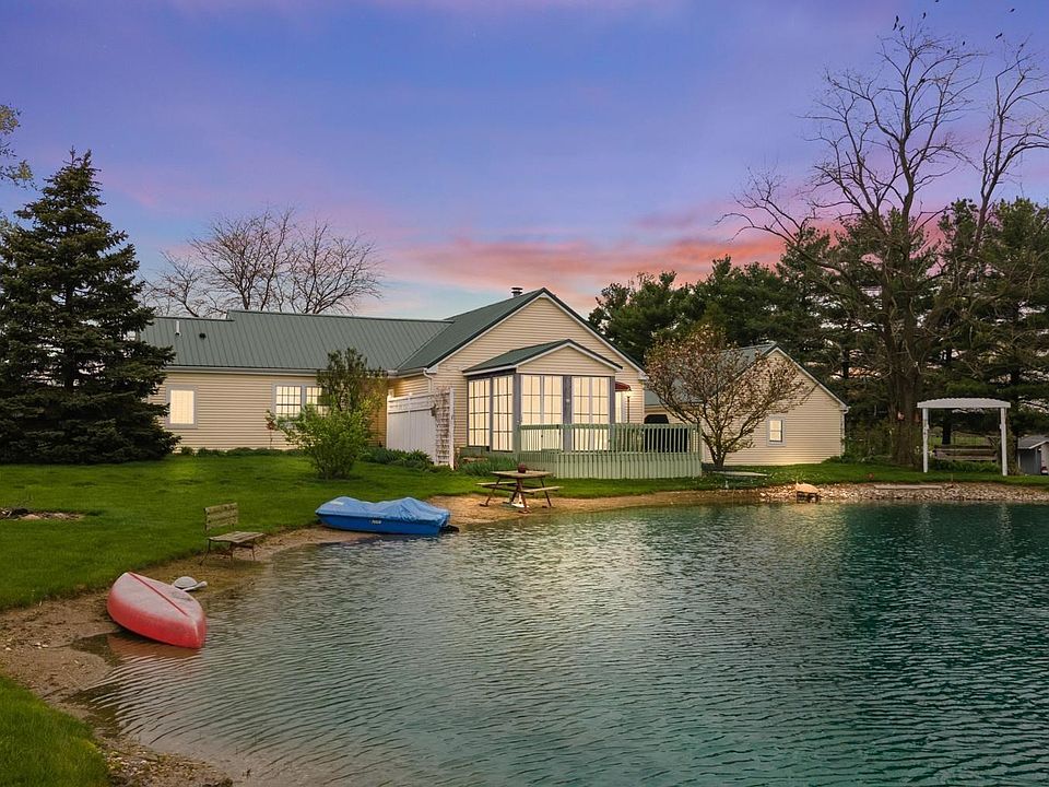 ...Offer Accepted....Leo Schools, Beautiful country property, enjoy gorgeous sunrises and sunsets 1828 sq ft ranch on 1244 sq ft basement. 2.15 acres with 3/4 acre pond, incredible views. 30 x 20 garage, sunroom, many recent updates include New Roof (metal lifetime) 2011, 3 Season Room- 2011 New Siding house and garage- 2011 HVAC-2016 Generator- 2017 Invisible Pet Fence 2021 ,Gas Logs for Fireplace 2022,New Gutters with gutter guard Soffit and Facia 2020. Master bedroom/ bathroom features jetted tub, sauna and steam room, full walk in closet plus office off bedroom , 3 bedrooms in all with 3 1/2 baths. kitchen, double oven electric range and stove, microwave, refrigerator and pantry. Great room features fireplace and vinyl plank flooring. Newer 3 season room overlooks pond and has EZ breeze windows.