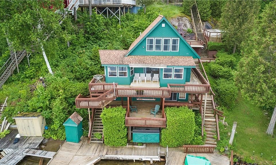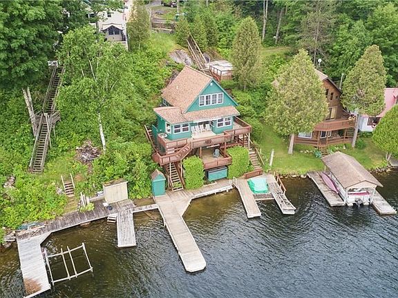BEST and HIGHEST offer by October 25,2018. Don't miss this opportunity to own a majestic three story/3bed/1bath cottage on Lake Bonaparte, in the heart of the Adirondack Mtns. Make an appointment today to view the gorgeous fall foliage and tree reflections on the water. Plentiful dock space for jet skis and boats. Two separate parking areas,four layers of decking. Sit around the fire pit on the upper deck,walk out of living room sliders onto second deck overlooking lake. Handcrafted bar on third level. Cottage comes fully furnished. It also sleeps plenty! Master bedroom on main level,two additional bedrooms upstairs. Extra storage in basement,along with covered locked kayak storage down on the docks. Turn Key-Move in Ready. Buy now to enjoy the fall and be ready for the new summer season.