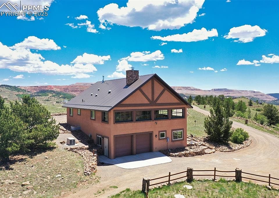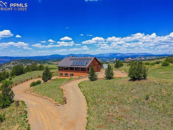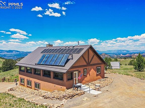 Custom home built "on top of the world" w/ 11+ acres, views in every direction incl. the Sangre de Cristos, Wet Mountains, Collegiate Peaks, Pikes Peak & surrounding mountain ranges. 100% solar home w/ 2 types of solar, Photovoltaic & Solar Thermal Systems! Completely automated systems to cycle upon your energy needs! Energy costs are just a few dollars per year for propane! This incredible home incl. 3600 sf of enclosed space, w/ 820 sf wraparound sunroom deck featuring custom roll-up garage door windows bringing the outdoors in! Living area features vaulted aspen T&G ceilings overlooking rocked floor to ceiling wood-burning fireplace. The adjacent dining area incl. walkout to covered glass sunroom w/ views streaming in! Entire home is done in solid Oak cabinetry, kitchen incl. black energy efficient appliances, double oven, & pantry closet. Expansive main floor owners suite offers a walk-in closet & en-suite 3/4 bath, attached to a powder room accessed from the hall for guests. LL cozy family room incl. a wood-burning stove & 2 additional bedrooms, served by a full bath. Bonus sunroom situated adjacent the family room, suitable for an office/exercise room. Upgraded features: 6” insulated walls; R-48 insulation in the attic; tile flooring throughout w/ "radiant in-floor" heat; 36” width solid 6 panel Oak doors; Energy Star rated appliances & windows; 8 solar tubes throughout both levels encapsulating the sun; high efficiency ultramodern solar components; solar thermal collection & distribution system; 6 LFP batteries; boiler backup high efficiency propane heating system; Kohler generator; heated & finished garage; 8'x26' storage container; two 1500 gal H2O storage tanks for fire protection; low maintenance Stucco exterior; heavy gauge steel roof; completely fire mitigated w/ "hand placed" riprap rock xeriscaping; Minutes to Cripple Creek for entertainment; great cellular coverage and unobstructed high speed broadband internet & satellite TV. Addt'l 10 acres avail.