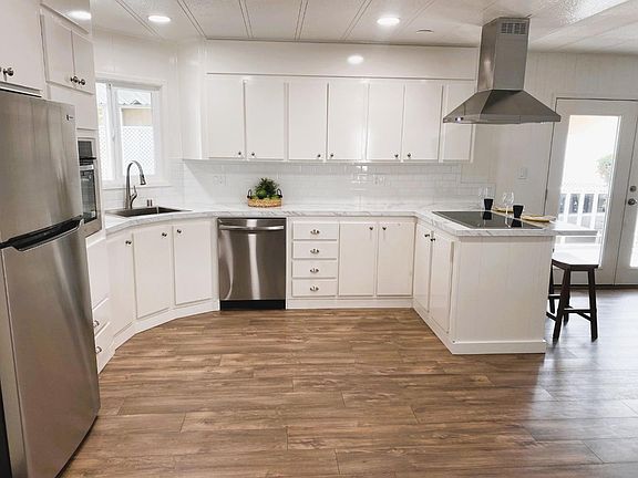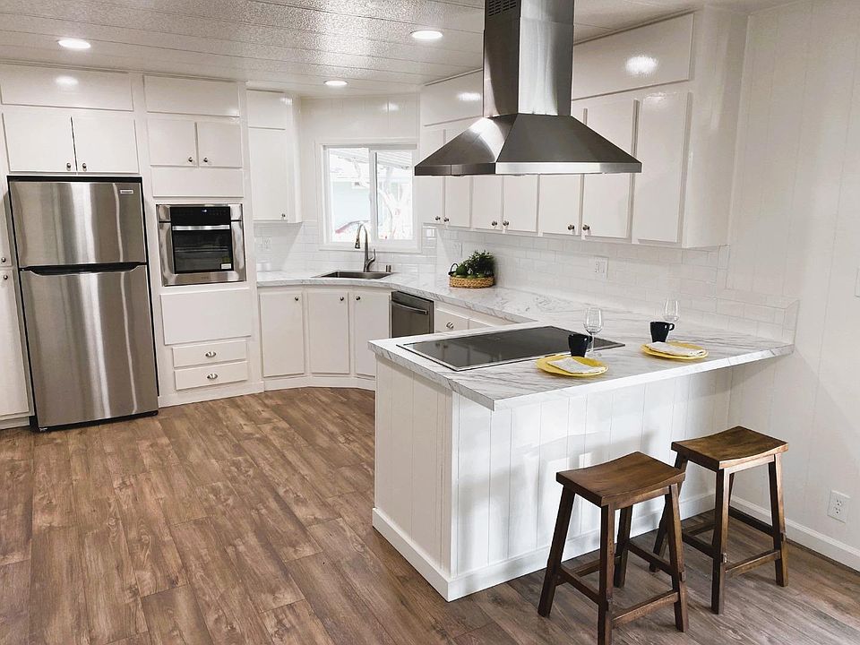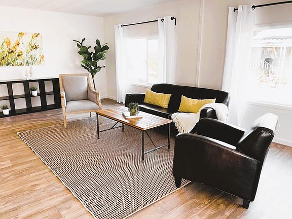 Fully Remodeled, VERY Low Space Rent ($830) and No Property Taxes! Two bedrooms, two full bathrooms. 1,512 square feet. Double pane windows. Large kitchen and Family Room open floorplan. All new stainless appliances and beautiful new white cabinetry. Spacious Living Room with lots of natural light. Recessed lighting. New flooring throughout. Laundry Room. Freshly painted inside and out. Fenced yard and patio. Located in the highly desirable Georgian Manor Mobile Home Community. Buyer must be 55 years or older to qualify for the park. Space rent is $830.