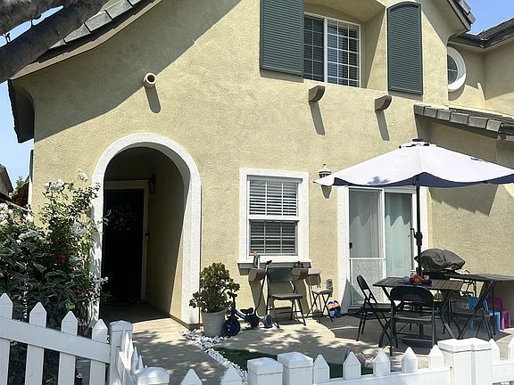 VA Assumable loan at 2.99%!! 3bed/2.5bath 1500SF twin home style townhome with 2 car side by side direct access garage in the darling French Tudor exterior at Bellame in Otay Ranch. Let the white picket fence entry into your new home great you with an paver pathway, paver patio & turf to soak in sunny SoCal weather. Inside an open floor plan invites you into the well sized living room with tiled gas fireplace, slider to the yard, tall ceilings, and laminate floors. Dining area opens to the kitchen space with eat in bar, new quartz counters, SS appliances inc fridge, and pantry space. Custom wrought iron railing. Upstairs primary with ensuite primary bath. Close to community pool/spa and playground. Close proximity to Veterans Elem, Santa Venetia Park, Mater Dei HS, & Otay Ranch Mall. FHA/VA OK