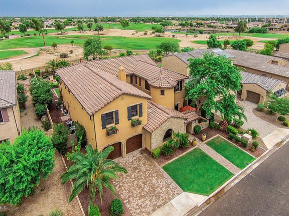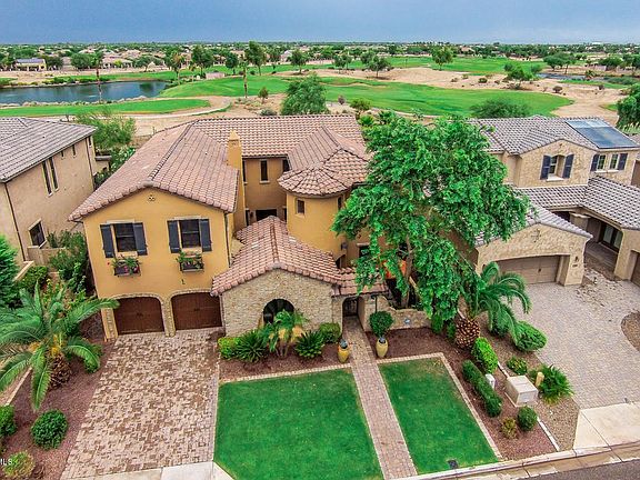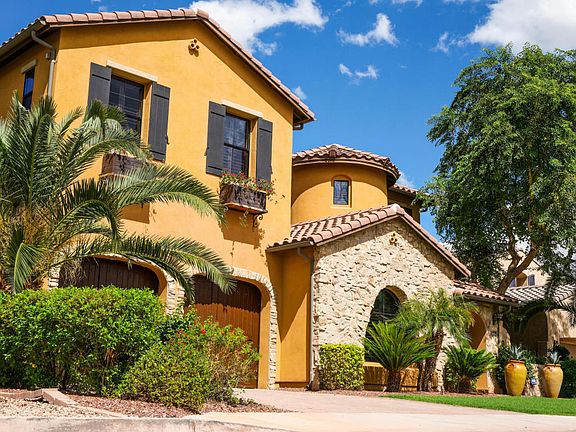4 bed, 4 bath stunning showcase Euro-style home at the gated Cortile in Palm Valley. Tuscan inspired features carries throughout, from toned accent paint, dramatic lighting & ceiling fans, stone fireplace & ceramic tile flooring. Office/Study just inside front entry. Chef's kitchen features all Viking appliances, granite counters, island breakfast bar to walkin pantry. Luxury master retreat features sitting room, private walkout balcony with golf views of 13th green and overlooking the park like spacious back yard. Interior paver courtyard w/ fireplace ideal for quiet private relaxation. Large covered patio with pavers leads to sparkling pool, open grassy area and additional enclave with firepit, perfect setting for entertaining year around. Spacious