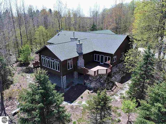 This sportsman/wildlife viewing paradise includes an expansive lodge-style cedar home situated on 30 secluded acres of natural habitat, is immediately adjacent to Crystal Mountain ski/spa resort property. Large deck and patios extend living outdoors and are complimented with a four-season sunroom, screened-in porch, two fire pits, gazebo, and vibrant landscaping. A unique property with custom touches like Brazilian wild-cherry flooring, large formal dining room, informal indoor/outdoor dining, gas fireplace, and gas and natural wood stoves. This home is well-suited for a large family (area available for a 4th and 5th bedrooms), hunting club or corporate retreat. In addition to substantial indoor storage, you will find a heated and insulated 30' x 36' 3 car garage, and a 36' x 76' insulated steel building with concrete floors, and overhead doors with openers. Generator located in outdoor steel building provides quiet, confident power. Hiking and ATV trails enable exploration of diverse habitats. A short ride off property offers additional activities including Sleeping Bear National Lakeshore, Iron fish distillery, World class fishing, golf, and all water sports. This is your home from which to launch your "up North" experience.
