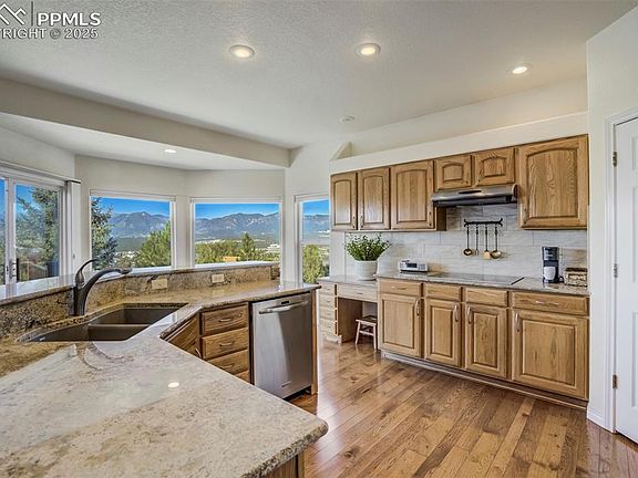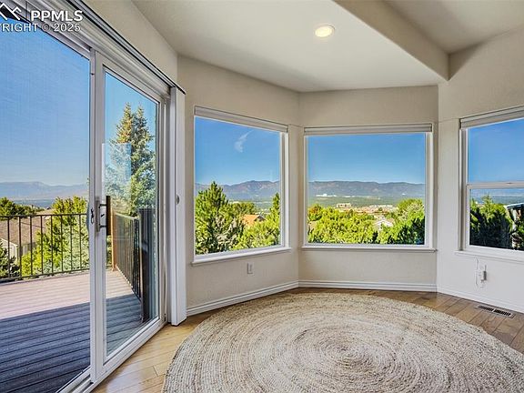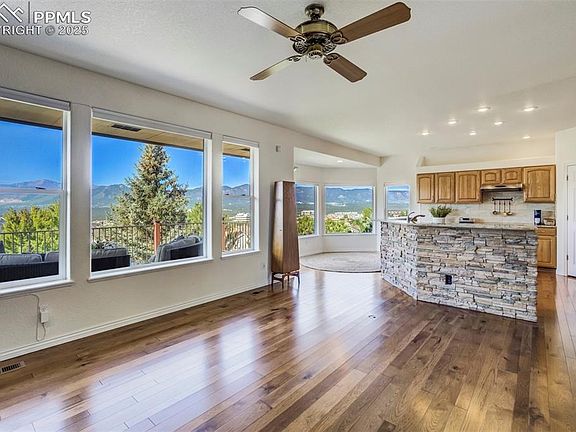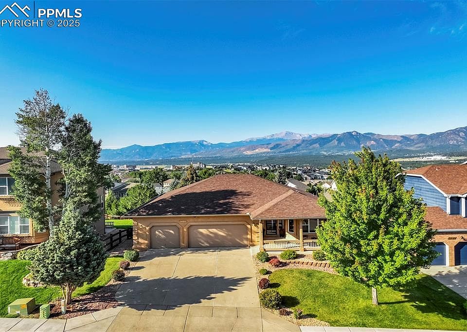 Experience breathtaking views of the Front Range and Air Force Academy from this open concept ranch home with a scenic walkout basement. Nestled in mature landscaping, this home boasts a spacious main level owner’s suite with a stunning mountain backdrop, a spacious 5 piece bathroom and convenient one level laundry access. It features 4 generous sized bedrooms, a private office with glass french doors and a 3 car garage. Pristine hardwood floors are showcased throughout the main level - including the owner’s suite and closet. The kitchen is perfectly positioned to view the Air Force Academy and is framed with mature trees and endless, uninterrupted sky views. It is equipped with Kitchen Aid appliances and granite counters, flowing seamlessly into the inviting living area with a beautiful stone fireplace.The walkout basement features a lower level outdoor entertaining area, large recreation room with a large wet bar and second stone fireplace, perfect for entertaining or relaxing with family. A separate storage area with ample space ensures you have room for all your sentimental and seasonal belongings. Enjoy year-round comfort with air conditioning, a whole house humidifier, and the peace of mind offered by Ring security cameras. Modern Hunter Douglas blinds add a stylish touch to the windows throughout the home. With an in-ground sprinkler system, your outdoor oasis will always be vibrant and lush. Don’t miss the opportunity to make this mountain view haven your forever home.