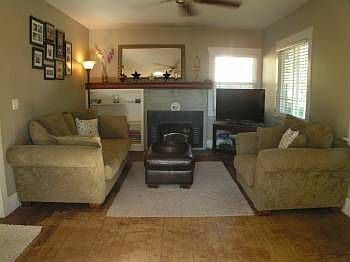 Large living room with fireplace and built in book shelves. Off of the living room is the kitchen and dinning area. The Kitchen has cabinet storage space, dishwasher, laundry area, and access to the backyard, detached garage, and large multiple level wooden deck, with views of many mature trees.