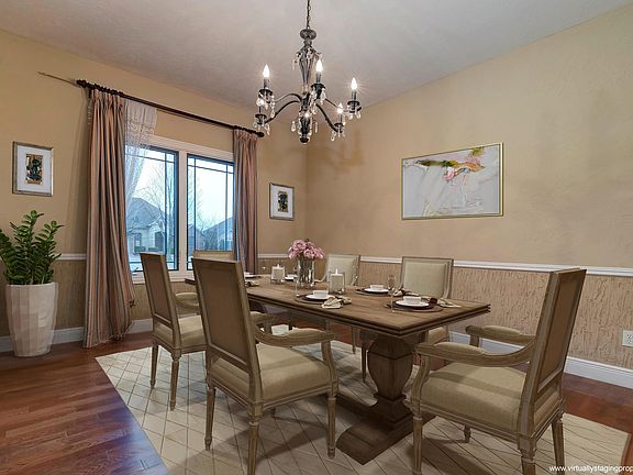 This beautiful 1.5-story home with walkout basement in established Lakes at Wild Horse subdivision exudes quality throughout. You'll find intricate woodwork, textured walls, hardwood flooring and crown molding. The kitchen has granite counters, stainless steel appliances and custom alder cabinetry. The living room opens to the formal dining room featuring a rope-trimmed chair railing. The spacious master bedroom is conveniently located on the main level.Two bedrooms and a full bath are upstairs. The fully finished walkout basement has space for both work and play with a family room, wet bar, 2 bedrooms, full bath, storm shelter and John Deere room. The covered deck and patio look out to the large backyard with lush, mature trees. Ideally located to walk to the pool or Hickory Hills school.
