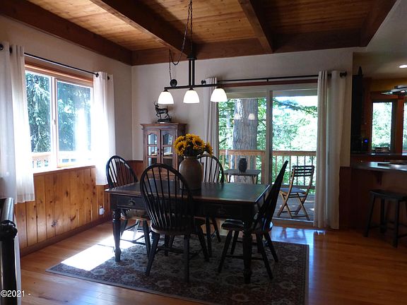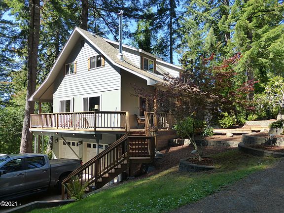 Beautifully updated & maintained, this home sits in a very private & forested 5.4 acre setting. Features hardwood floors, beamed ceiling, & a new Lopi woodstove in the main living area, a large kitchen with custom cabinets & lots of storage & SS appliances including a Wolf propane cooktop with griddle. The master suite has an attached den/office/sitting area, a walk-thru closet, a shared bath, & a private balcony with jetted tub. Upstairs are 3 more bedrooms & a bath surrounding a game/TV room with built in storage. The lower level has a one bedroom, one bath apartment or guest accomodation with three outside entrances & a double garage with laundry hookups. All new decks & stairs with covered porch in front & covered deck off of the kitchen/dining areas. On 3 tax lots & city services too!