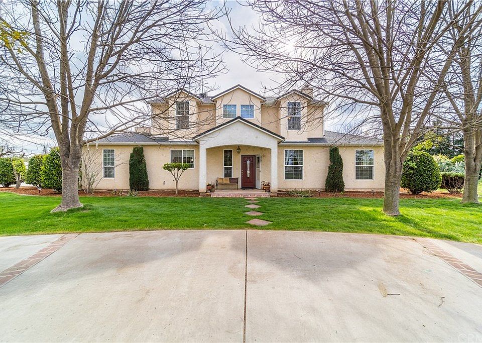 Behind the iron gates sits this stunning custom built home on 5 acres! You will fall in love with its peaceful ambiance, the open floor plan, the high ceilings, the gleaming wood flooring and the large windows that invite ample amount of warm sunlight. 4 full bedrooms PLUS an office. The gorgeous living room features a fire place and the oversized formal dining room which is perfect for entertaining family and friends. The gourmet kitchen is a cook's dream, which includes a center island, a breakfast bar, granite counters, double oven, gas stove and pull out drawers. There are two master suites, one on each floor and there is a bonus room that can be used as an office or library with access to the exterior. The master suite on the 2nd floor offers coffered ceiling, walk in closet, dual vanities, jetted tub and has its own balcony. 2 whole house fans were just installed. This home is situated in a fully fenced 5 acres of peaceful setting and offers fruit orchard, R.V. hookups, barn and plenty of room for shop, livestock and horses. Chicken coop is included and is already cross fenced for your animals. Fruit trees include pomegranate, apricot, peach, fig, plum, persimmon, cherry, orange, lemon and grapefruit, your own little farmers market! Enjoy breakfast on the large covered patio while enjoying the view of the mountains and the unobstructed view of the star lit sky at night. LITERALLY WALK THROUGH THIS HOME WITHOUT LEAVING THE COMFORT OF YOUR OWN HOME WITH OUR 3D TOUR!