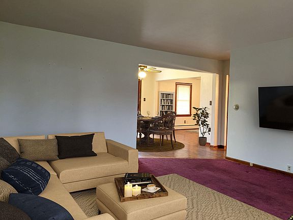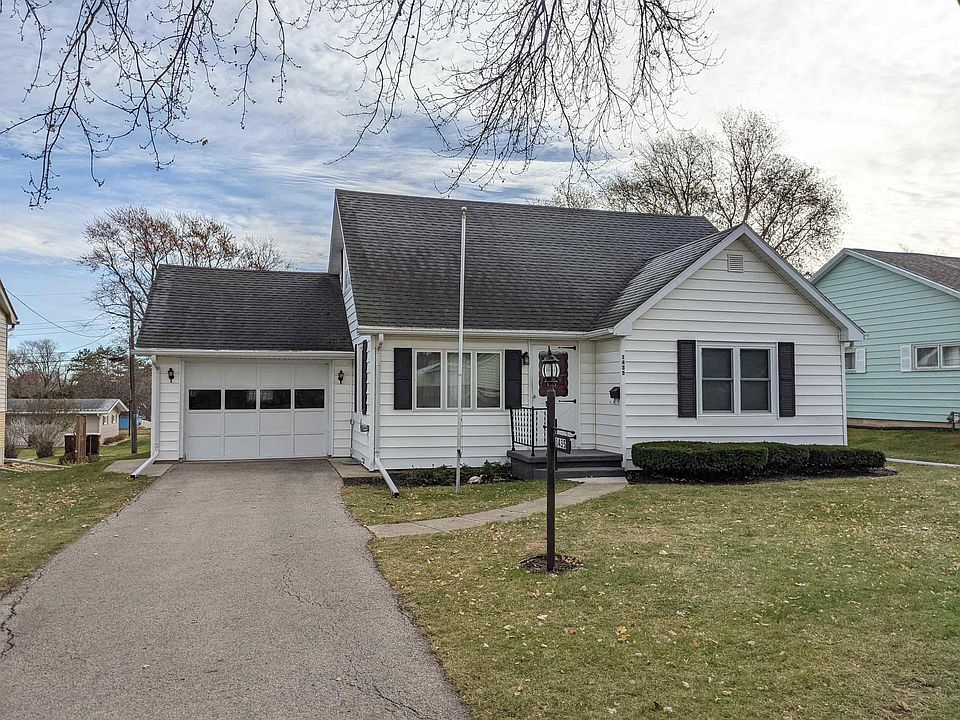 Larger than it appears, main floor features living room with hardwood floors under carpet open to dining area with door to 24' x 12' patio, open to office or bonus room and kitchen with all appliances, full bath, bedroom and attached oversized 26' deep and 14' wide garage. Upstairs features two bedrooms and half bath. Lower level has usable game/rec room area, laundry with wash sink and plenty of storage. Updates include roof and windows. Some furniture virtually staged.