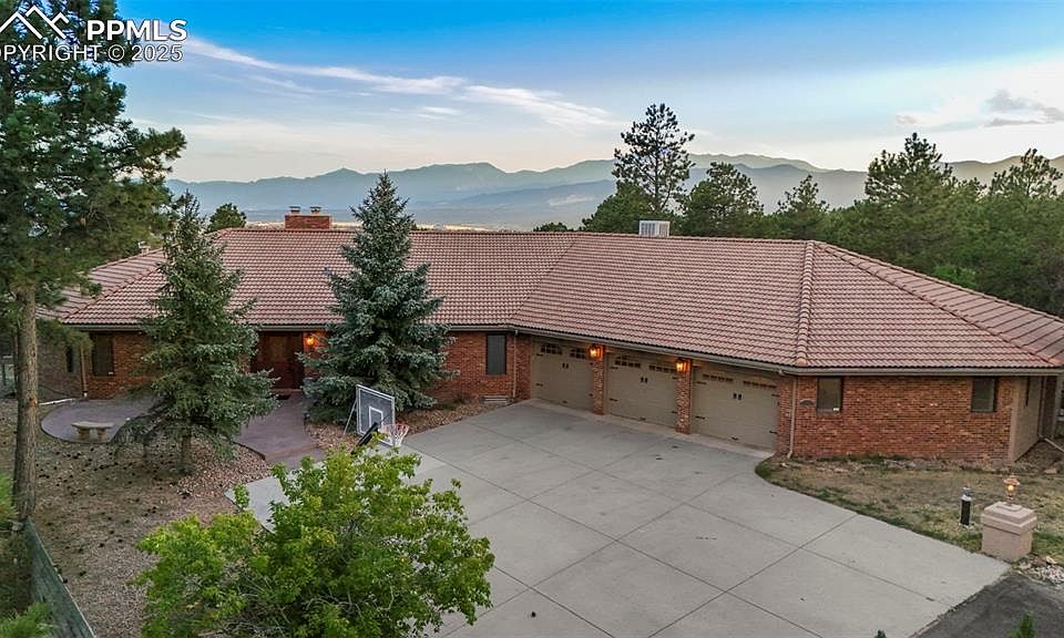 Phenomenal hill top location in close proximity to Flying Horse on almost 6 treed acres with a sprawling 8,000 sq ft custom built rancher and unbelievable unobstructed 100 mile views of Pikes Peak, the mountain range, the Air Force Academy and views of the city lights at night. Incredible close-in location giving you the best of both worlds - mere minutes to the city amenities you need in daily life yet living on gorgeous acreage. Finished walk-out lower level, 6 car attached garage, 6 bedrooms, 6 baths, 2 laundry rooms, new carpet, energy efficient radiant heat, expansive deck w/ awe-inspiring views and rain guard underneath. Low maintenance exterior with high end clay tile roof, composite deck w/ metal railings, metal clad casement windows, asphalt/concrete driveway, brick and stucco exterior. Main level primary suite w/ huge walk-in closet, private deck and a 5 piece bath w/ jetted tub and over-sized shower. A total of 5 ensuite bedrooms w/ large closets. Spacious great room w/ an abundance of windows, amazing mountain views, a wood burning fireplace w/ full stone wall surround open to the kitchen. The kitchen has an abundance of beautiful cabinetry, large pantry, island w/ storage and counter bar, double oven, slab granite counters, a wine fridge and stainless appliances. Large main level wood walled library/music room or game room w/ built-in bookcases. The lower level walks out to a large patio, deck w/ natural gas plumbed deck and prewired for a hot tub, has a spacious family room, a theater room w/ high quality surround sound speakers and screen. Award winning School District 20. Located within 5 minutes of Northgate and the Flying Horse Golf Course, 10 minutes to the Air Force Academy, 50 minutes to South Denver. Quick access to Highway 83 and I-25. Close proximity to Fox Run Regional Park and Black Forest Regional Park for amazing outdoor recreation space. Located in a small community of high end quality homes. Outbuildings are allowed. All paved roads.